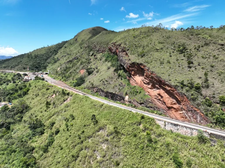 Mapeamento geomecânico ao longo da ferrovia para avaliar as condições dos taludes em rocha e mistos.
